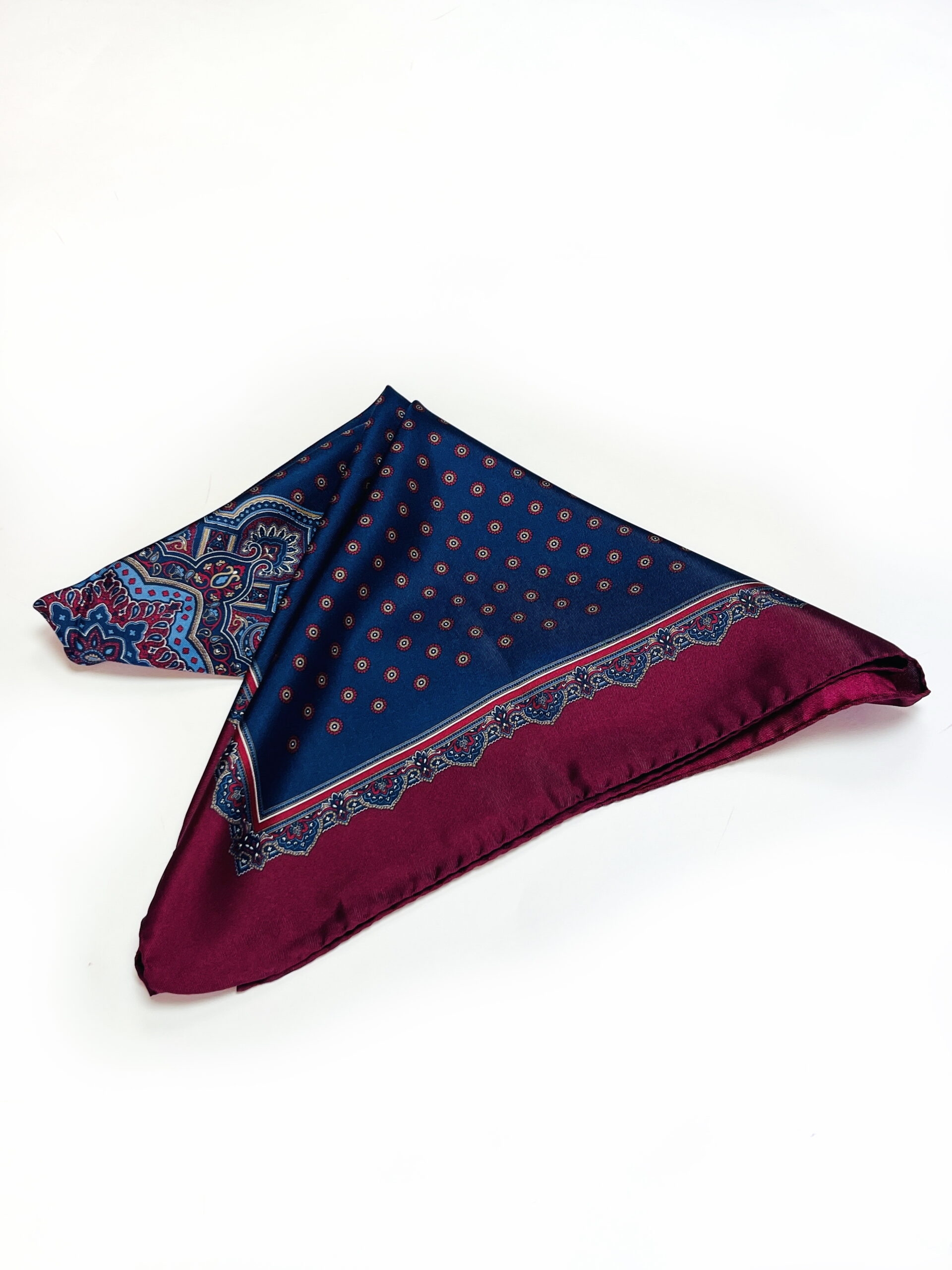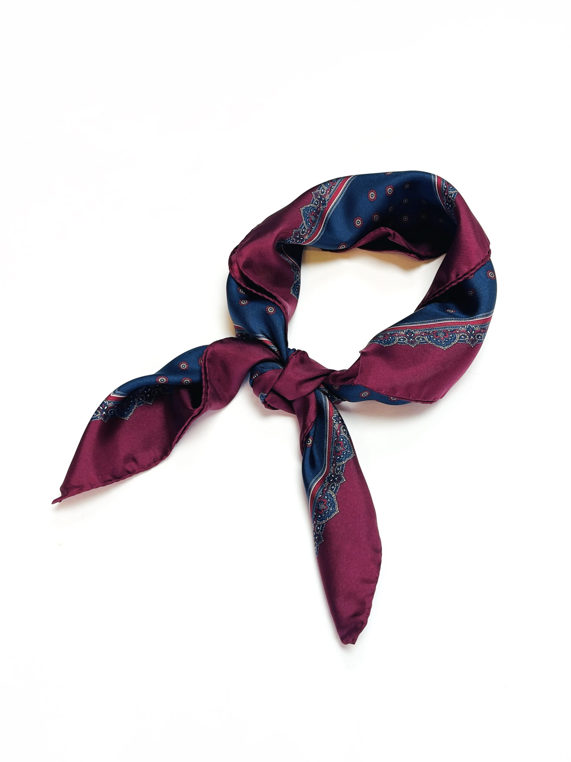 Natūralaus šilko bordo kaklaskarė su raštais yra elegancijos ir išskirtinumo pavyzdys, kuris gali praturtinti bet kokį garderobą. Ši skarelė, pagaminta iš 100 % natūralaus šilko, užtikrina ne tik prabangos pojūtį, bet ir maksimalų komfortą dėvint. Šilkas garsėja savo švelnumu, lengvumu ir gebėjimu puikiai priglusti prie odos, o tai leidžia šį aksesuarą naudoti tiek kasdienėje, tiek ypatingomis progomis. Dėl unikalių raštų ir išskirtinių spalvų derinio – gilios bordo, sodrios mėlynos – ši skarelė taps nepamainomu jūsų įvaizdžio akcentu, suteikiančiu jam šiuolaikiško ir modernaus atspalvio.