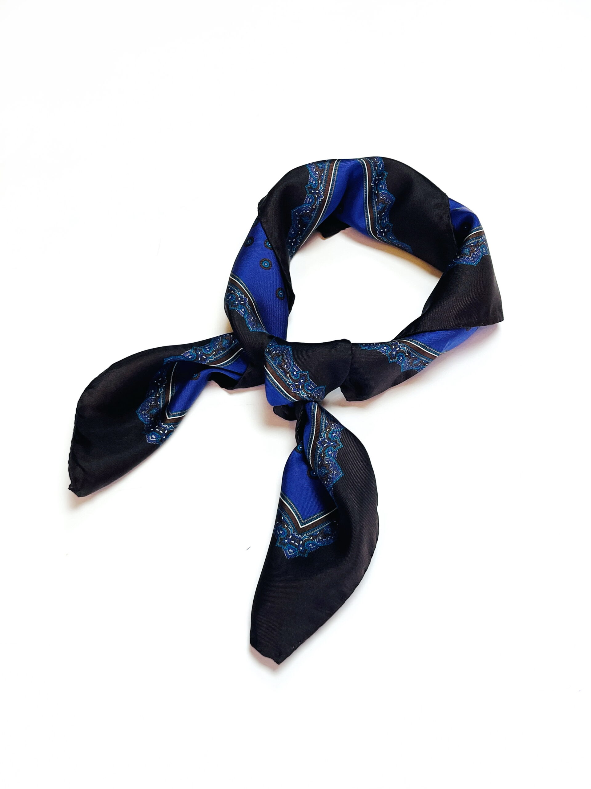 Natūralaus šilko skarelė su geometriniu raštu puikiai žiūrėsis rišama po marškinių apykakle (ar ant jos), derinama prie įvairių kostiumų, marškinių ar šiltų golfų.