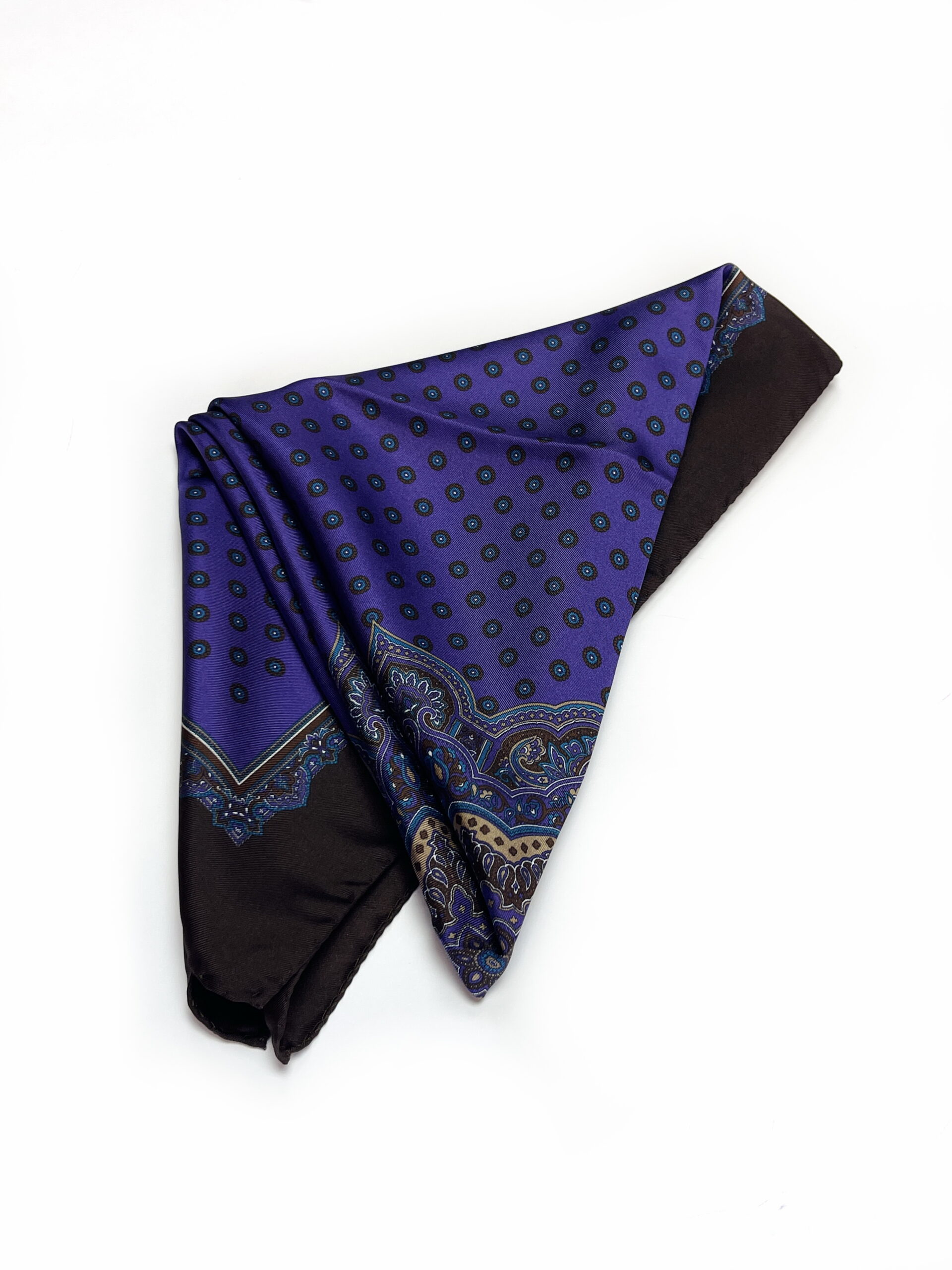 Natūralaus šilko violetinė kaklaskarė su raštais – unikalus ir stilingas akcentas