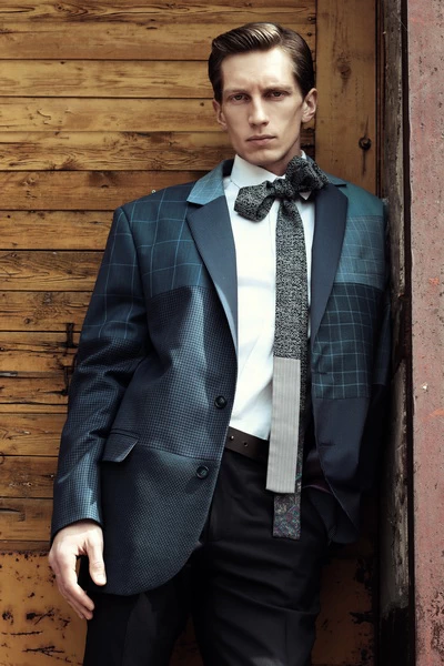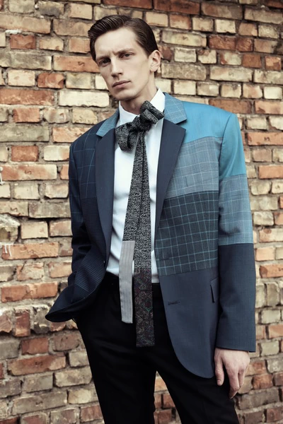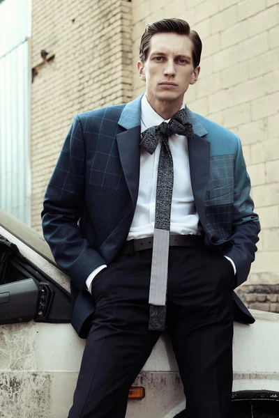 Vienetinis vyriškas tvaraus dizaino  švarkas – pagamintas iš 120’s kokybės vilnos audinių atraižų. Kiekvienas audinio fragmentas kruopščiai parinktas, kad harmoningai susilietų į subtilų skirtingų tekstūrų, raštų ir mėlynos spalvos atspalvių derinį. Švarkas pasižymi lengvai krintančiu siluetu, užtikrinančiu komfortą ir eleganciją, o preciziškai atliktas siuvimas išryškina aukštos meistrystės lygį.
