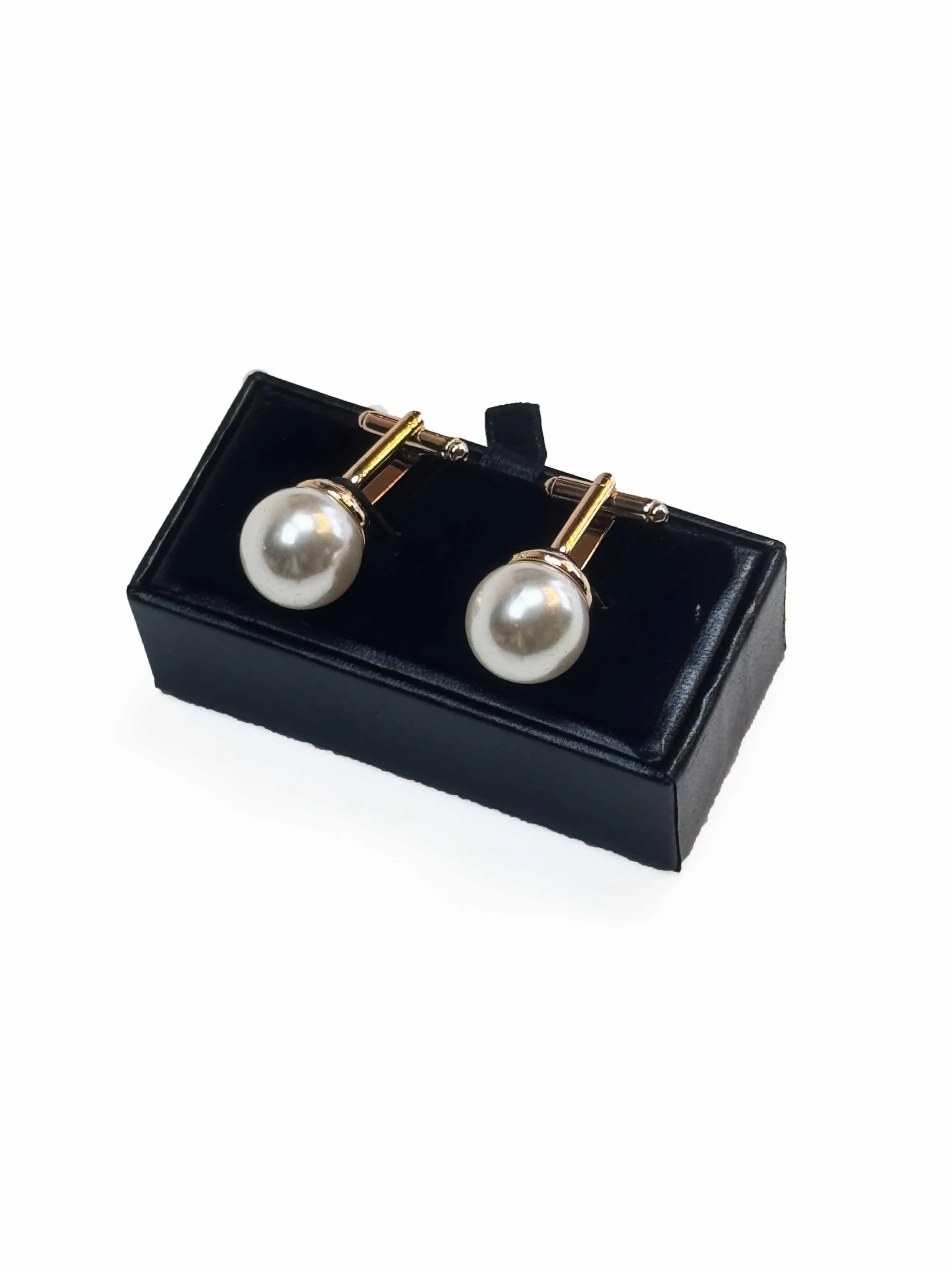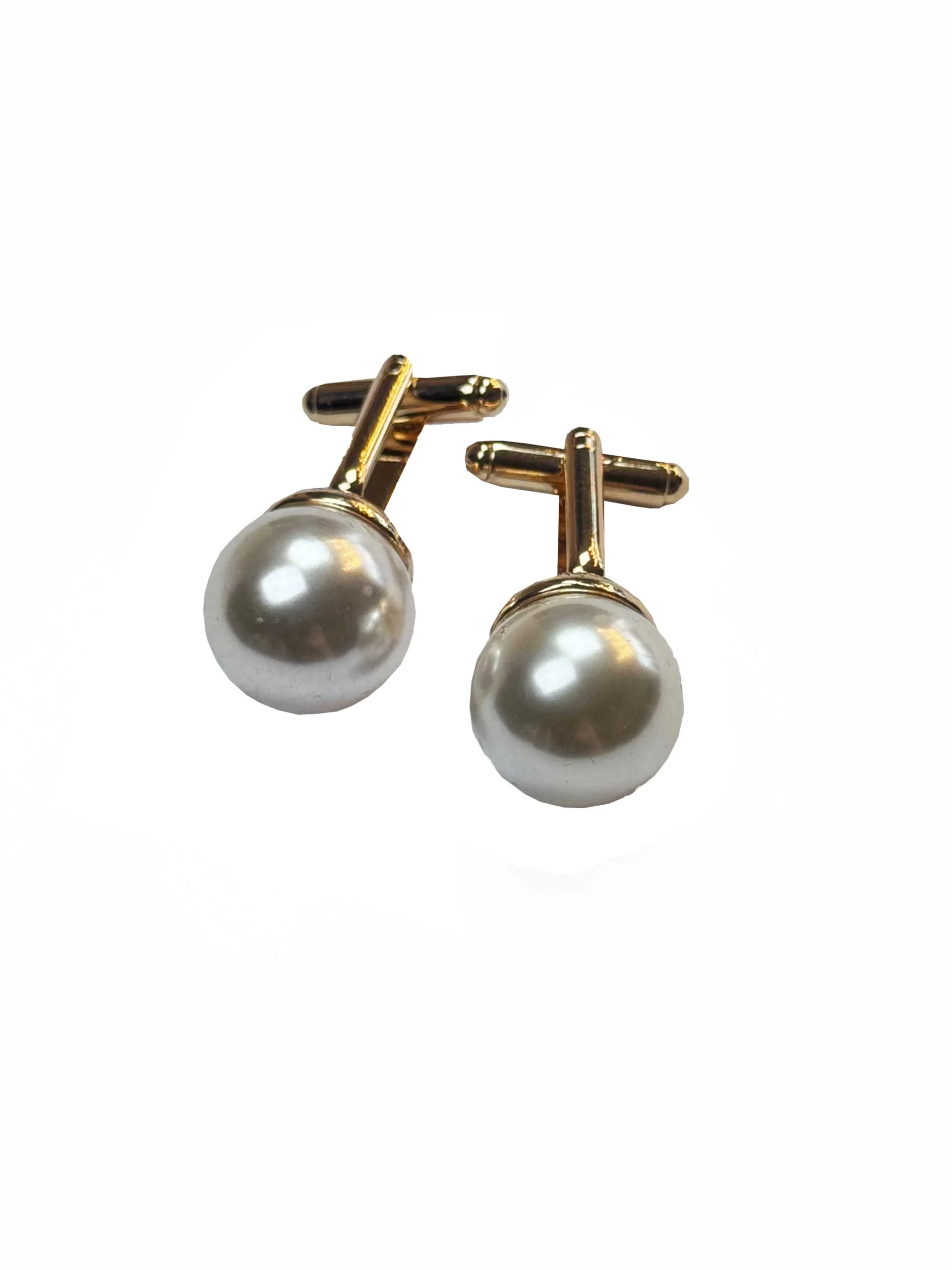 Apvalios formos sąsagos su masyvia perlo imitacijos detale, pritvirtinta prie auksinės spalvos metalo pagrindo. Baltas, švelniai blizgantis perlo paviršius kuria prabangos ir rafinuotumo įspūdį. Šios sąsagos išsiskiria klasikinės elegancijos pojūčiu ir puikiai dera prie šventinių bei iškilmingų aprangos derinių.