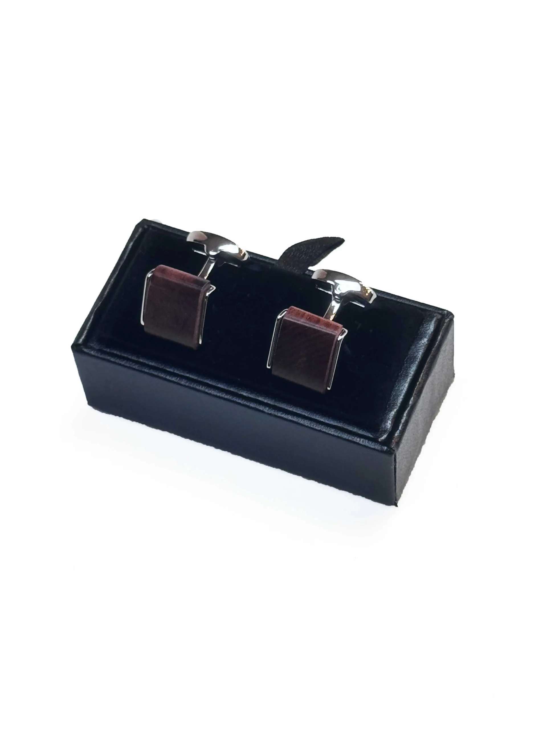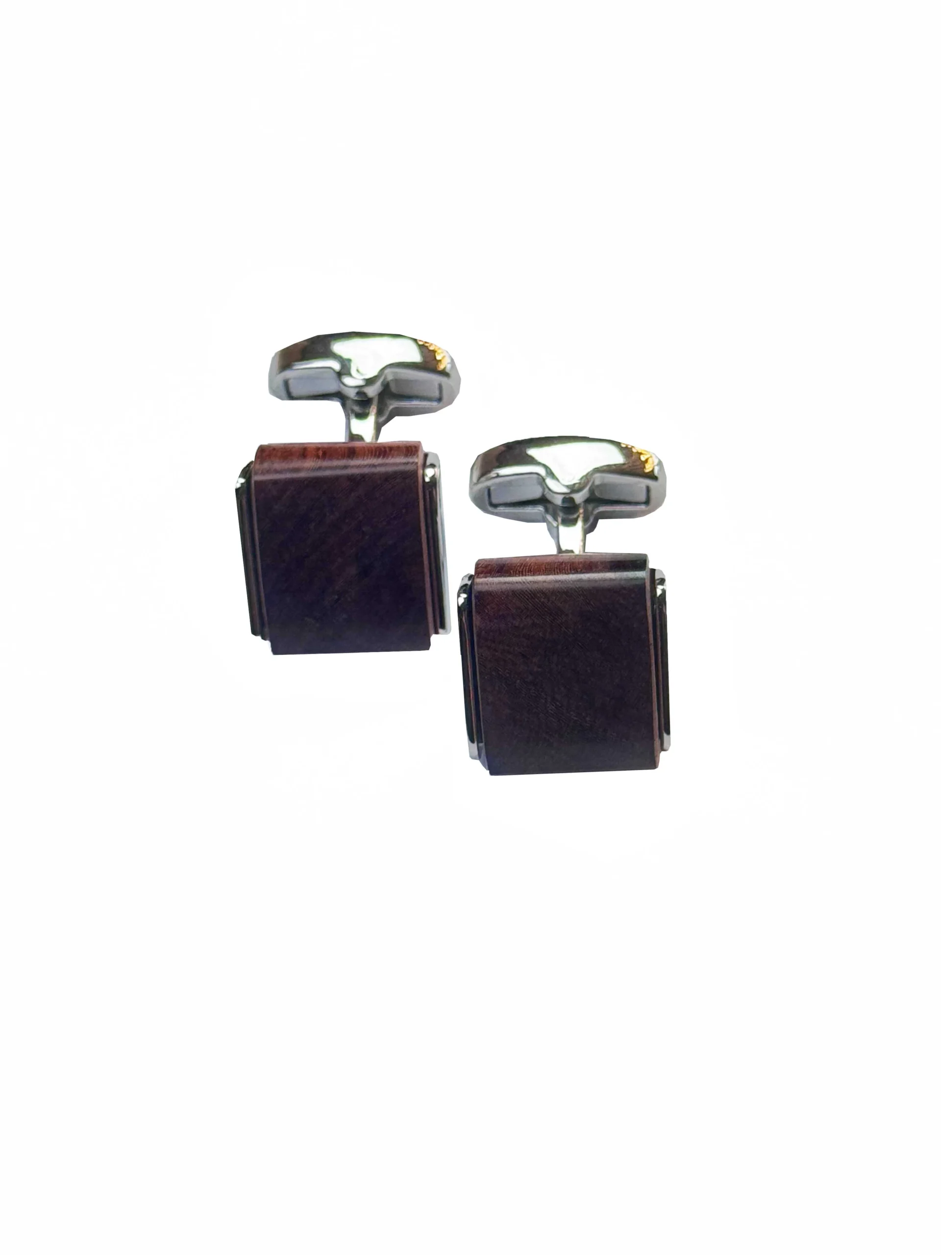Stačiakampės sąsagos su tamsaus medžio detale, apsuptos sidabro spalvos rėmeliu. Gamtos įkvėptas dizainas ir kontrastas tarp natūralaus paviršiaus bei metalo žvilgesio suteikia aksesuarui išskirtinumo ir solidumo. Tai puikus pasirinkimas vyrui, vertinančiam paprastumą ir eleganciją.