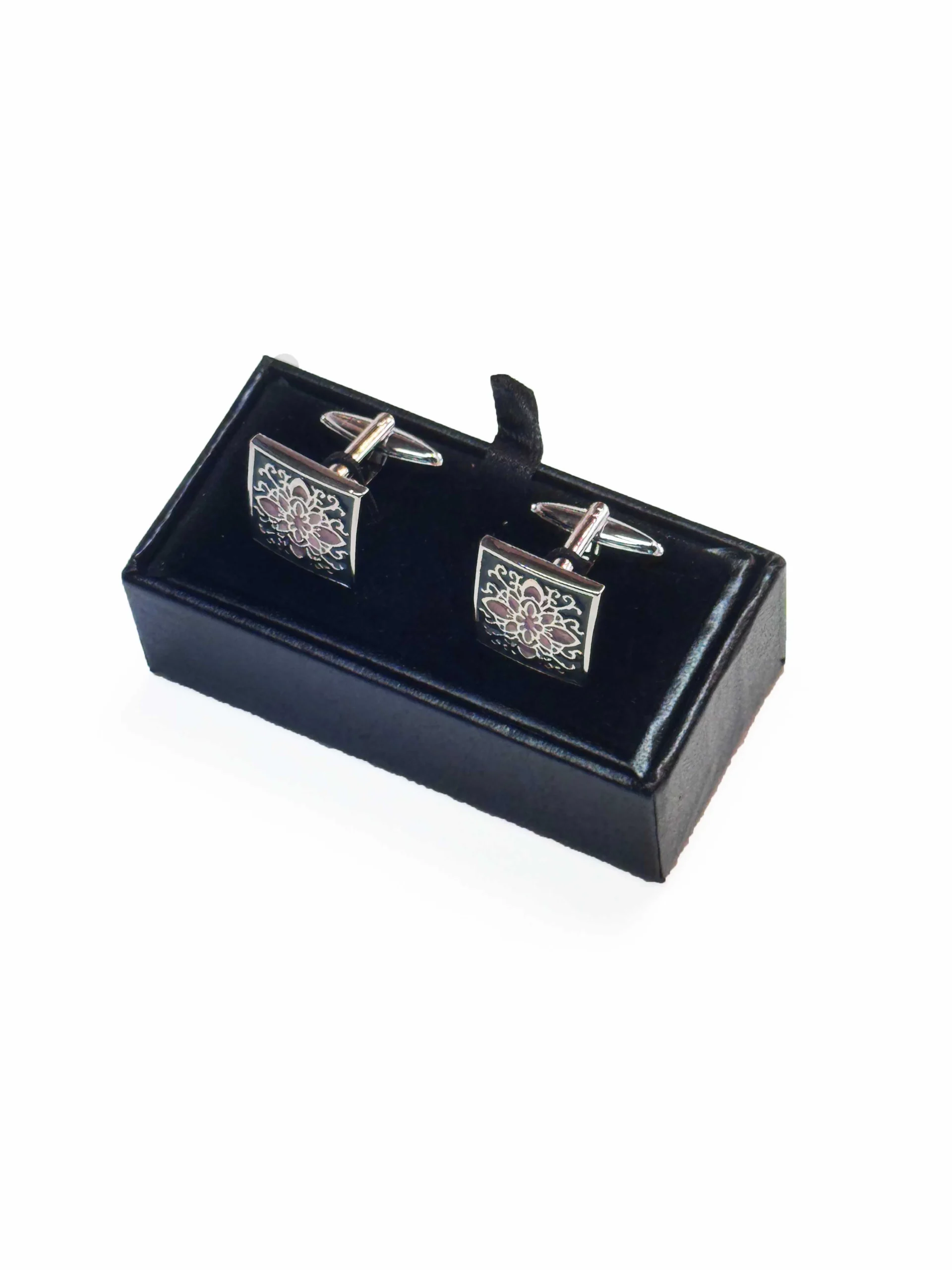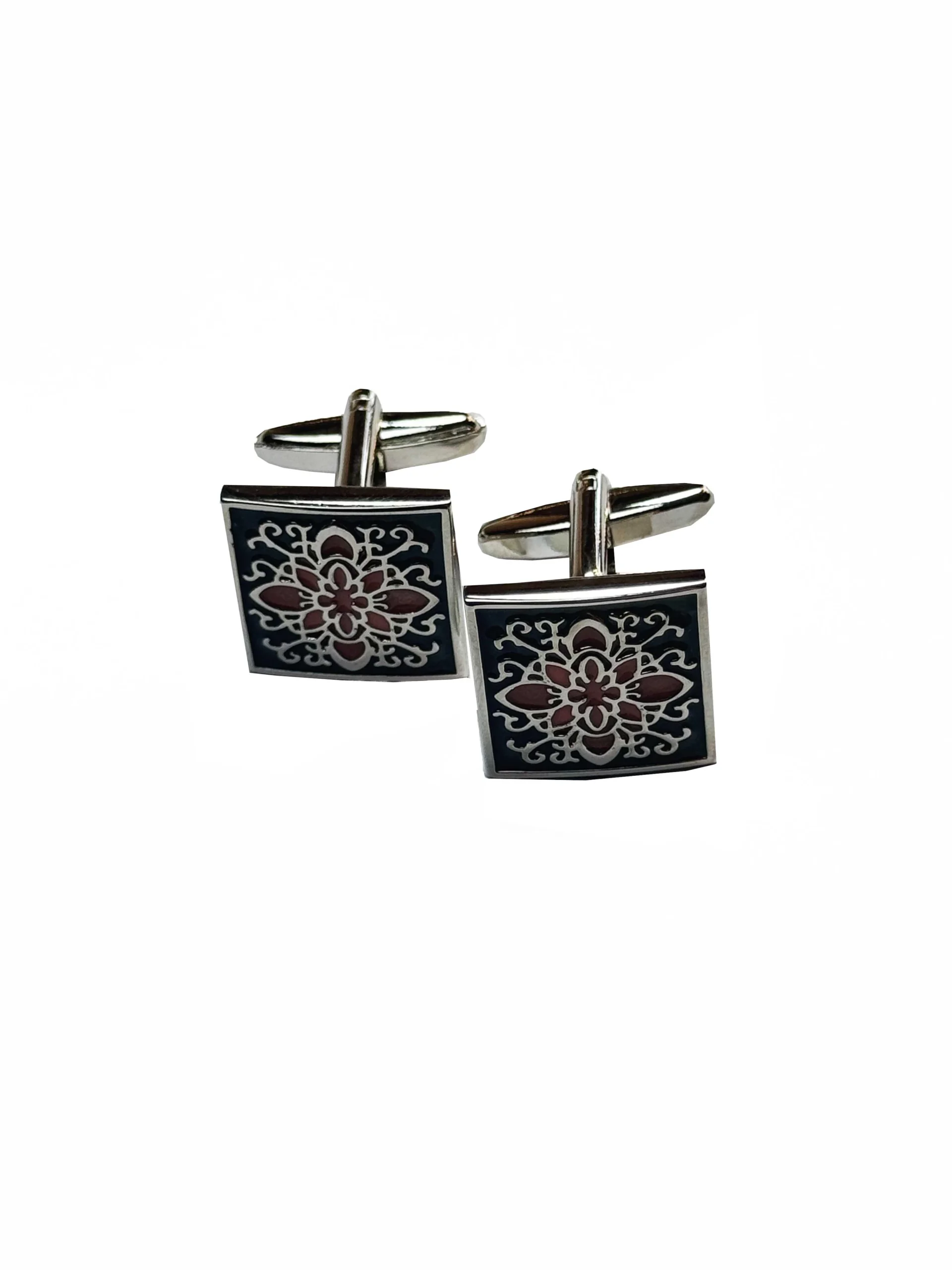 Kvadratinės vyriškos sąsagos pagamintos iš sidabro spalvos metalo, suteikiančio subtilų žvilgesį ir eleganciją. Ornamentas ant sąsagų kontrastuoja su sidabro fonu – jo užpildas derina pilką ir rožinį atspalvius, suteikdamas detalėms gilumo ir vizualinio žaismo. Šis spalvų derinys pabrėžia rafinuotą stilių ir leidžia sąsagoms tapti išskirtiniu akcentu tiek šventinėms progoms, tiek elegantiškoms kasdienėms aprangos kombinacijoms.