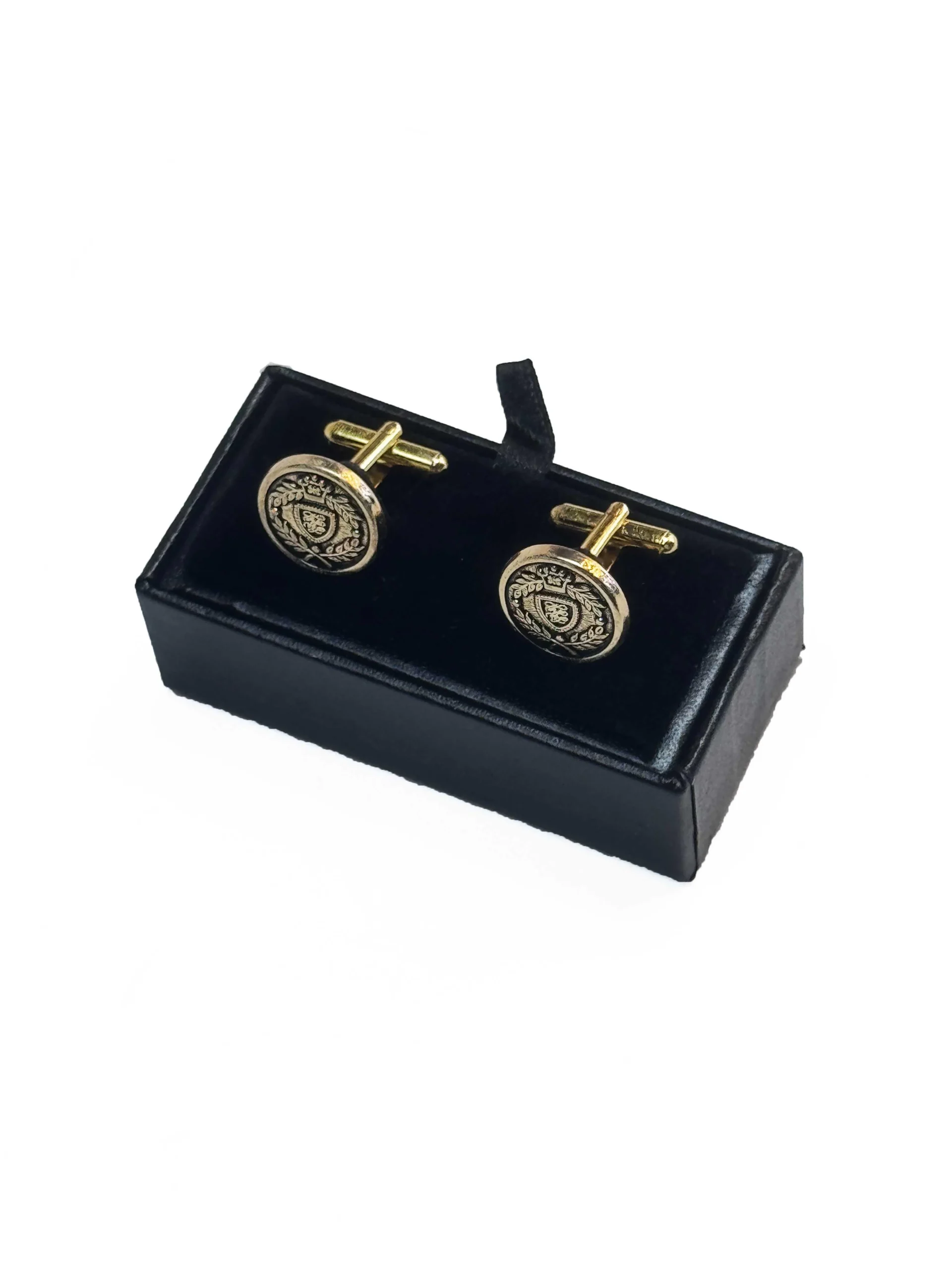 Auksinės spalvos apvalios sąsagos, puoštos juodos ir aukso spalvų herbo ornamentu. Klasikinis dizainas su karališku akcentu kuria solidų ir autoritetingą įspūdį. Puikiai tiks ypatingoms progoms ar oficialiai aprangai, kai norisi pabrėžti išskirtinumą.