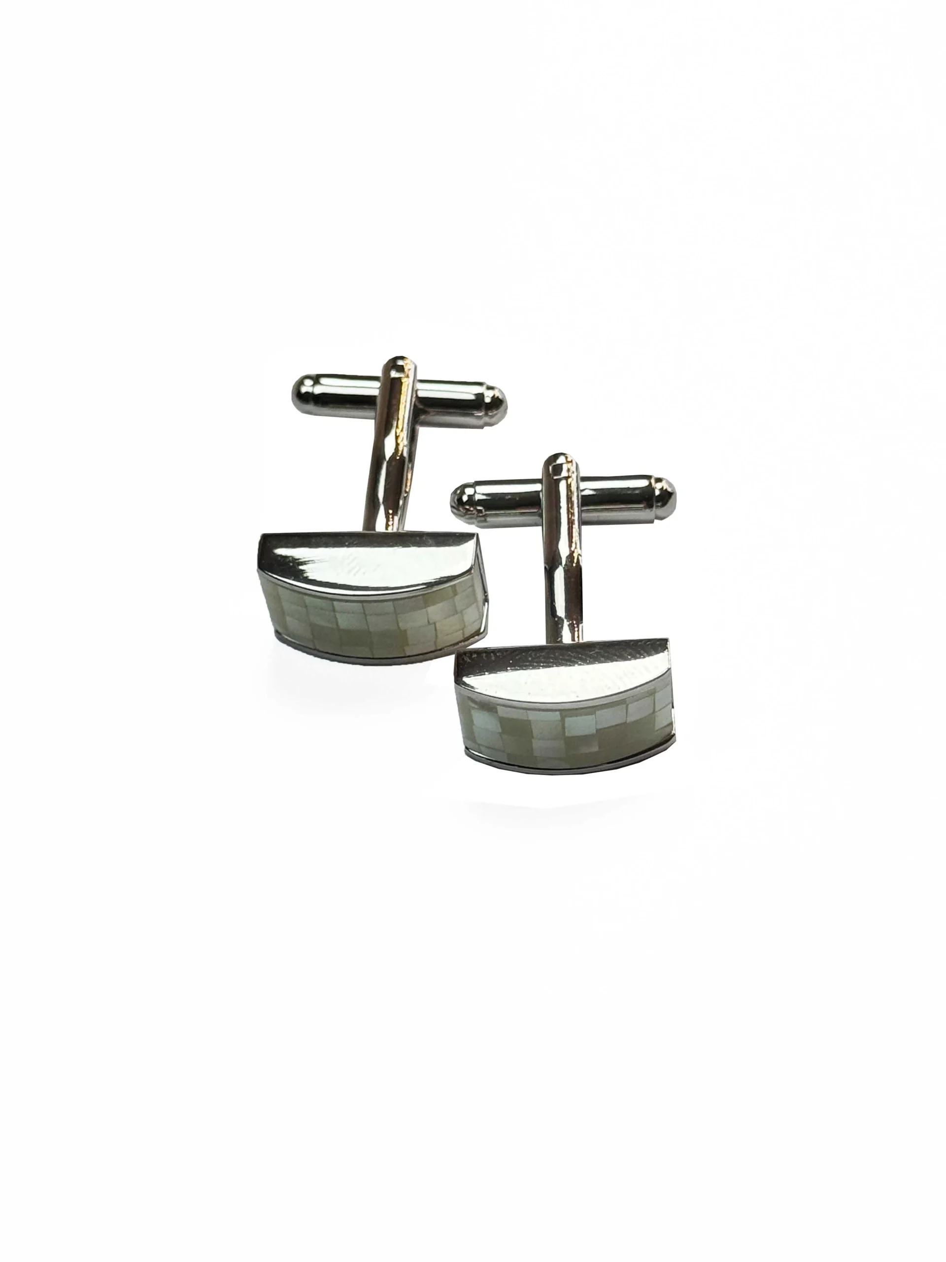 Išskirtinio dizaino lenktos sąsagos, dekoruotos smulkių kvadratėlių mozaika perlamutro atspalviais. Sidabrinis rėmelis paryškina šviesų raštą ir suteikia subtilaus prabangos pojūtį. Dėl savo unikalios formos ir šviesių spalvų jos atrodo lengvai derinamos prie įvairių kostiumų. Šis aksesuaras suteikia elegancijos, bet kartu išlaiko lengvą ir modernų charakterį.