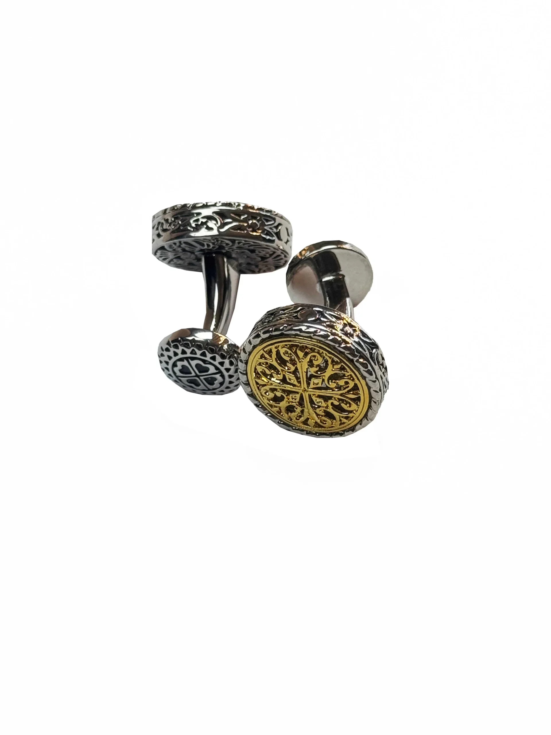 Sidabro spalvos vyriškos sąsagos apvalios formos su įkomponuotu aukso spalvos ornamentu. Kontrastingas spalvų derinys pabrėžia išraiškingą ažūrinį motyvą, kuris sukuria prabangų ir stilingą įspūdį. Dėka kruopštaus apdirbimo bei patikimo mechanizmo, sąsagos ne tik atrodo elegantiškai, bet ir užtikrina patogų dėvėjimą. Puikus pasirinkimas vyrui, ieškančiam subtilios, bet išskirtinės detalės savo įvaizdžiui.