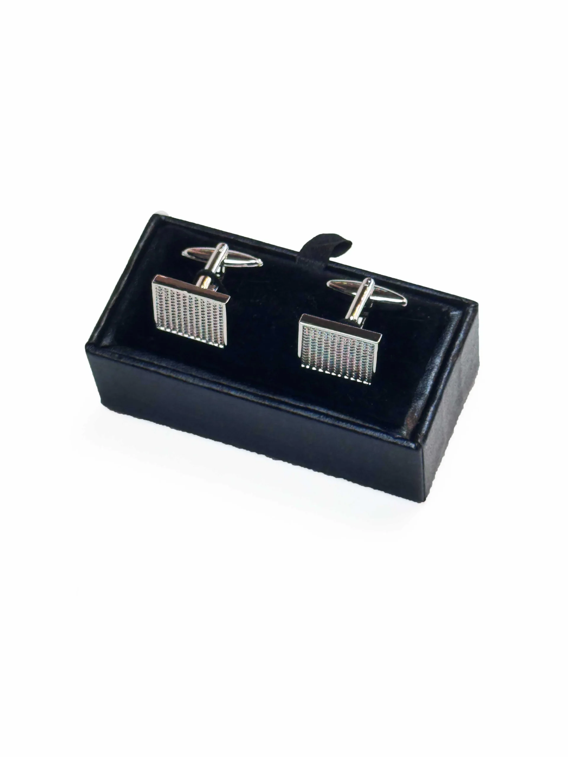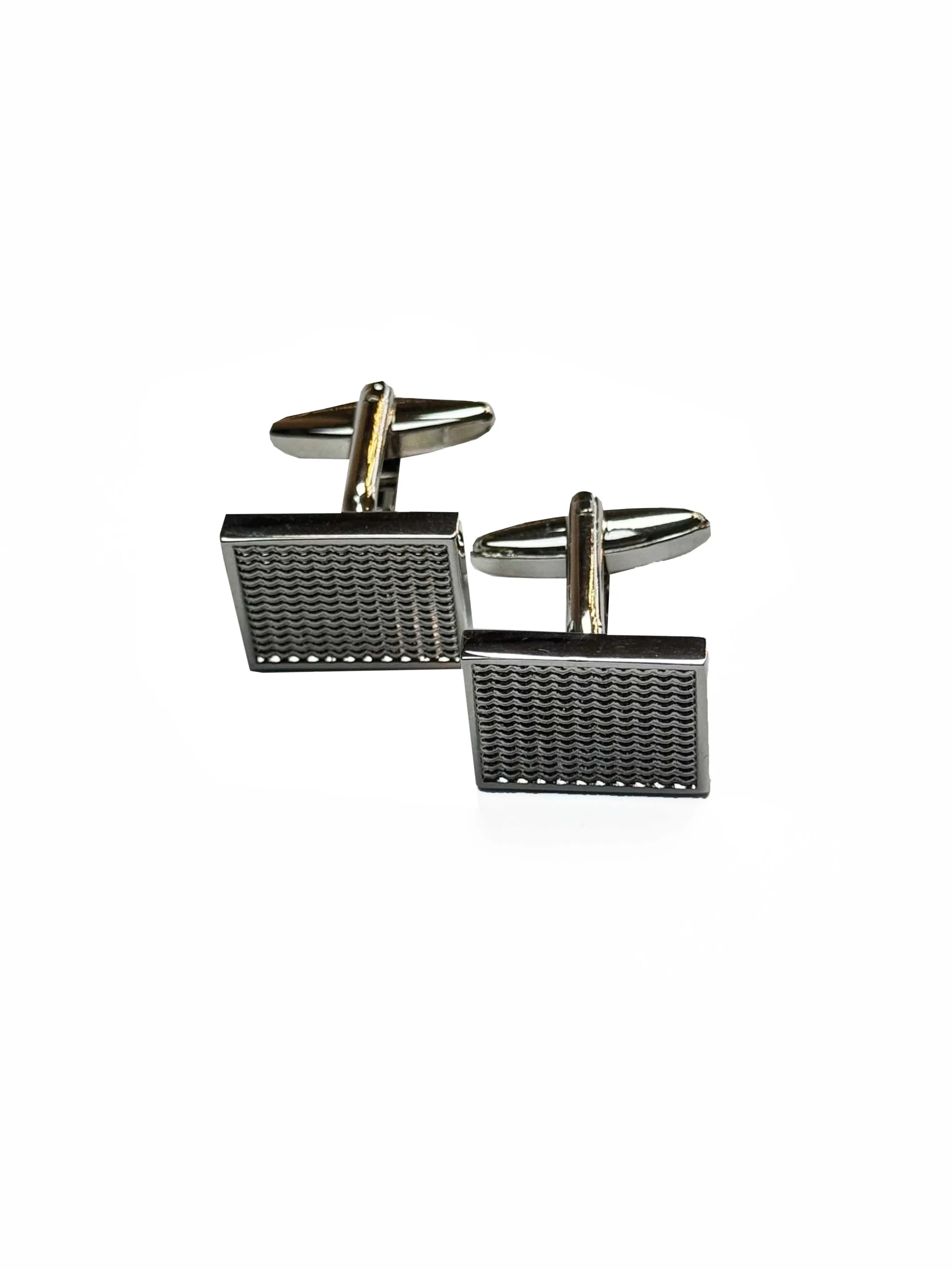 Kvadratinės formos sąsagos, pagamintos iš sidabro spalvos metalo, dekoruotos subtiliu tekstūriniu raštu. Paviršiaus faktūra suteikia aksesuarui gylio ir modernumo, o blizgi metalo apdaila išlaiko elegantišką, klasikinį įvaizdį. Šios sąsagos dera tiek prie oficialių progų aprangos, tiek prie kasdienio stilingo įvaizdžio.