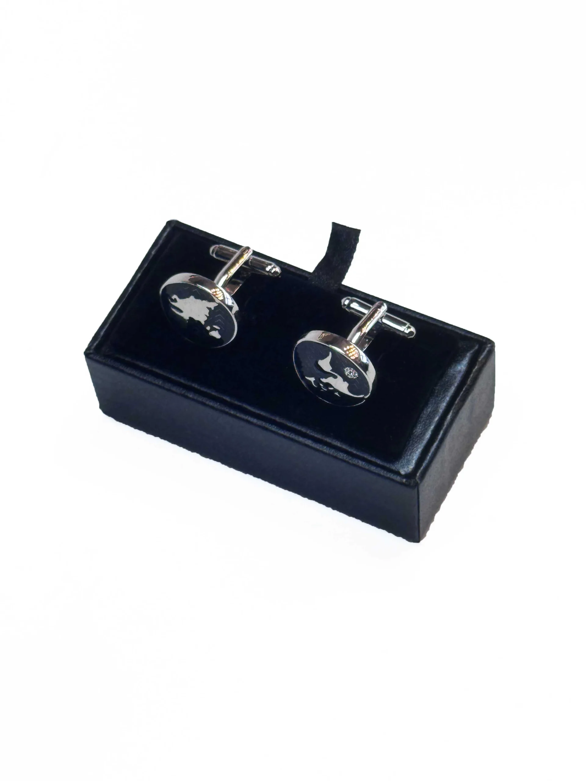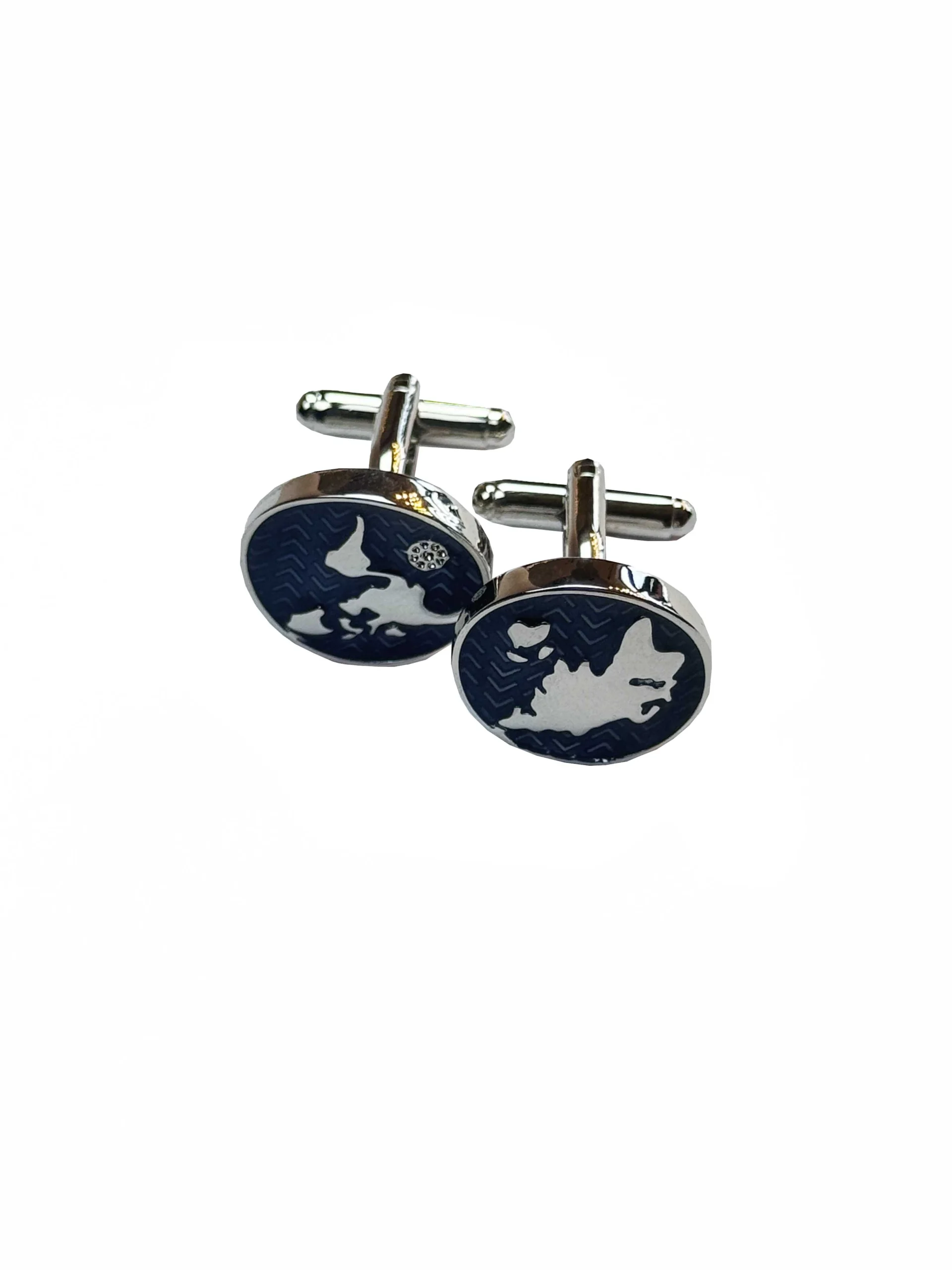 Apvalios formos sidabro spalvos sąsagos dekoruotos tamsiai mėlynu fonu, kuriame pavaizduoti sidabro spalvos žemynai. Fono tekstūra su subtiliu zigzago raštu suteikia papildomo gylio ir išskirtinumo. Kontrastas tarp mėlynos ir sidabro spalvų kuria aiškų, modernų įvaizdį, primenantį pasaulio žemėlapio motyvą. Tai originalus aksesuaras, puikiai tinkantis kelionių, geografijos ar išskirtinio stiliaus mėgėjams.